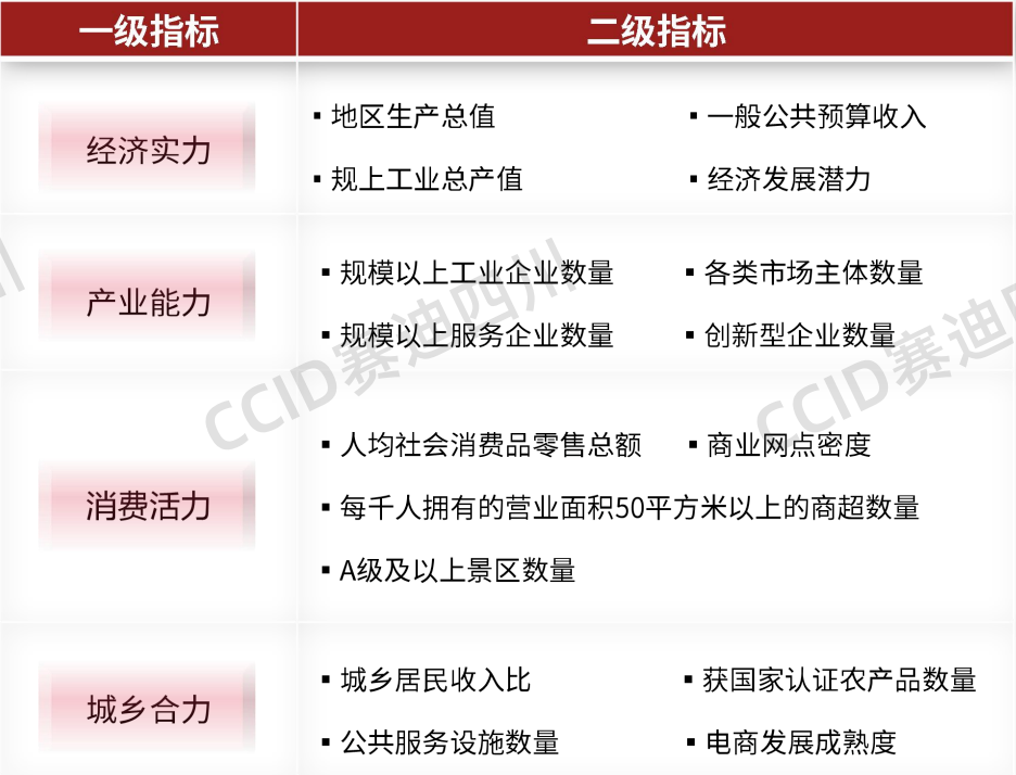 本次榜单从经济实力、产业能力、消费活力、城乡合力四个维度进行评价,每一维度都由相应的二级指标构成,研究评价指标体系共包括4个一级指标,16个二级指标。